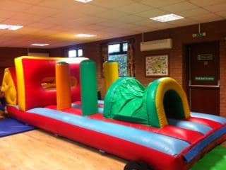 This obstacle course has the challenges of clambering through and over roller bars, inflated wall, bish ash poles and a tunnel. It is suitable for adults and children. It does not come with a cover. It is 24 ft long by 10 ft wide.
