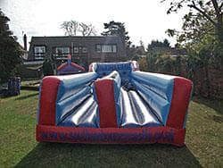 The Bungee Run is an excellent source of entertainment and fun for children and adults!! It has the theme of looney tunes!! The aim is to beat your opponent by running along the lane and placing your marker at the furthest point you can before the bungee rope pulls you back!! It does not come with a cover, but is suitable for hire indoors and outdoors. The unit is 35ft long and 12 ft wide.