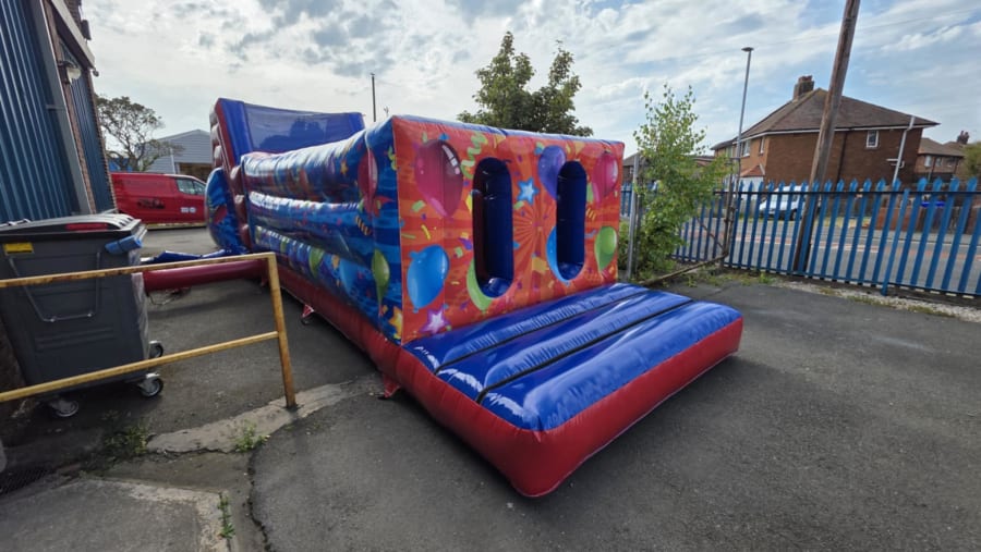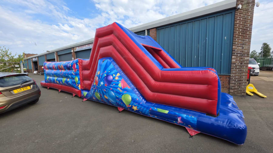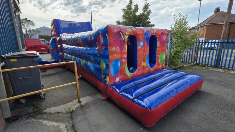 Looking to bring excitement and energy to your next celebration? Our obstacle course, assault course Party themed obstacle course 42 x 11ft in Southam, Leamington Spa, Warwick, Stratford upon Avon, Rugby, Daventry, Banbury, Warwickshire and surrounding villages is the ultimate attraction for parties, fetes, and all fun-filled occasions! This vibrant, action-packed inflatable features eye-catching party graphics and is designed to entertain guests of all ages, both indoors and outdoors.